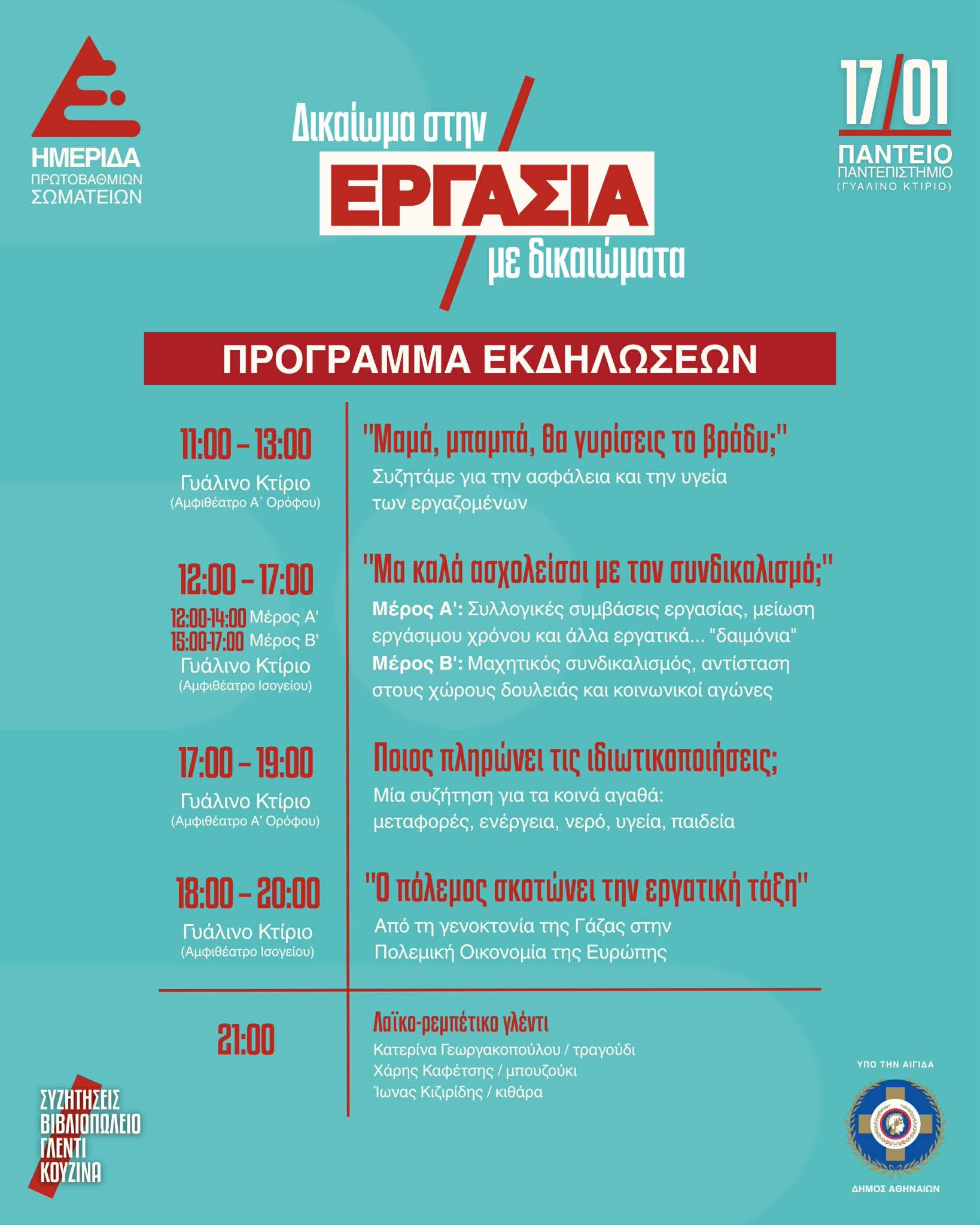 Σας προσκαλούμε στην Ημερίδα: «Δικαίωμα στην Εργασία- Εργασία με Δικαιώματα», που συνδιοργανώνουμε με άλλα πρωτοβάθμια σωματεία στο Πάντειο Πανεπιστήμιο, το Σάββατο, 17 Ιανουαρίου