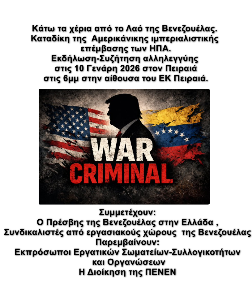To Σωματείο μας καταδικάζει την στρατιωτική επέμβαση των ΗΠΑ και εκφράζει την αλληλεγγύη του στον λαό της Βενεζουέλας και στον δίκαιο αγώνα του ενάντια στην ιμπεριαλιστική επέμβαση των Αμερικάνων φονιάδων των λαών στην πατρίδα του.