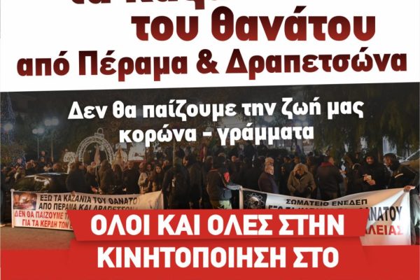 Συλλαλητήριο τη Δευτέρα 19/1 στις 18.30, πλ. Ηρώων Πέραμα ενάντια στην απαξίωση και την υποβάθμιση της ζωής και της ασφάλειας μας.